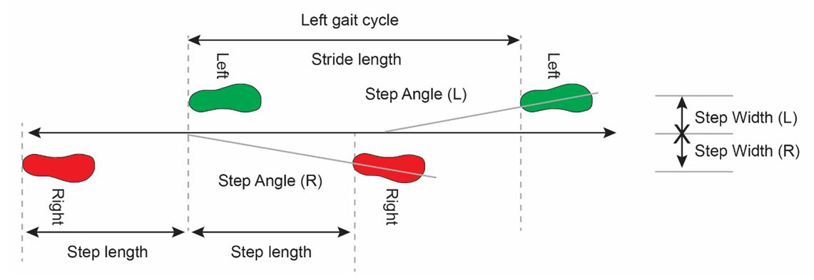 Looking at gait from a spatial perspective allows us to measure gait asymmetries related to distance between steps and strides lengths. Some typical spatial gait parameters are: step length, stride length, step width and foot angle.