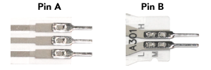 Pins crimped through silver traces on standard construction designs | Crimped pins that allow customers to solder leads, solder to PCB, or insert directly into compatible connectors or housings. Tekscan offers two types of these pins. Pin A is ideal for soldering, pin B is ideal for mating with connectors and can be soldered as well. Contact a Tekscan Applications Engineer for all soldering best practices and recommendations. |